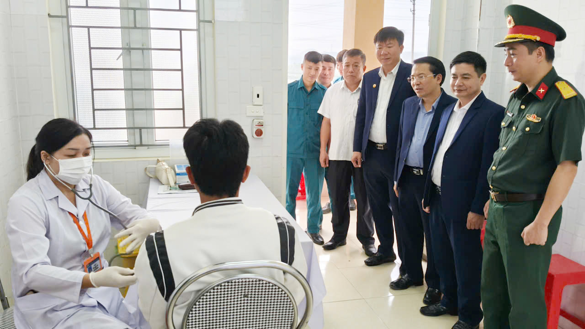 Đồng chí Thiếu tá Nguyễn Văn Trang, phó Chỉ huy trưởng, Ban chỉ huy Phòng thủ Khu vực 5 – Tĩnh Gia; cùng các đồng chí Ban chỉ huy Phòng thủ Khu vực 5 – Tĩnh Gia dự khai mạc khám sơ tuyển.